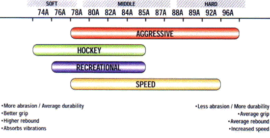 Udává tvrdost kola měřený ve stupnici „A“ pro in-line brusle a ve stupnici „A“ nebo „D“ u skateboardů, těm se ale věnuje samostatný článek. Tvrdost mimo jiné, je jedním ze základních parametrů, od kterých se odvíjí základní životnost, absorpce nárazů, lepivost, trakce a rychlost. Čím vyšší číslo před písmenem „A“ tím větší tvrdost kol. Stupnice „A“ označuje kola do hranice 98, až 100 kde nastupuje stupnice „D“ (ta je ale používaná jen u skateboardů). Upozorňujeme, že zásadně neplatí základní mýlky, že čím tvrdší je kolo, tím déle vydrží, nejvíce záleží na chemickém složení všech částí, kvalitě urethanu který je použitý a především na tom, zda je kolečko určeno na venkovní (outdoor) nebo vnitřní (indoor) použití. Obecně veškerá „indoor“kola mají nižší tvrdosti (pod 76A) ale shodnou životnost protože vnitřní povrchy jsou hladké a čisté, bez nerovností a kola se proto sjíždějí jinak a nelze porovnávat vnitřní kola s venkovními, pokud ovšem kola pro vnitřek nepoužíváte venku. Například kvalitní kola s tvrdostí 82A mohou vydržet déle než nekvalitní 85A, především u nekvalitních kol je třeba brát v potaz, že čím vyšší číslo „A“ tím nižší přilnavost neboli grip, a pokud kolečka nemají dobrou přilnavost, není dobré jezdit hodně rychle z kopce nebo do zatáček. Naopak, pro fitness mnoho lidí používá střední tvrdosti, protože přinášejí vyšší míru kontroly a absorbují lépe nerovnosti. Měká kola dříve odhází a je potřeba je často prohazovat.